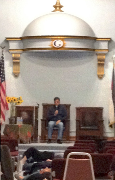If you attend his workshop, be prepared to jot down many notes. At times I felt like a scribe, trying to keep up as a plethora of brilliant and poetic expressions of wisdom rolled off his tongue. This happens in a very down-to-earth, and many times very humorous style. Although ironically at this particular event, he sat in a throne-like chair at the head of an old Masonic lodge… Of course, he poked fun at the apparent paradox, “Oh, before you leave tonight, be sure and wake the person seated next to you if they’re sleeping. You don’t want them waking up after we’ve gone, discovering that they’ve become part of some secret midnight Illuminati ceremony…”